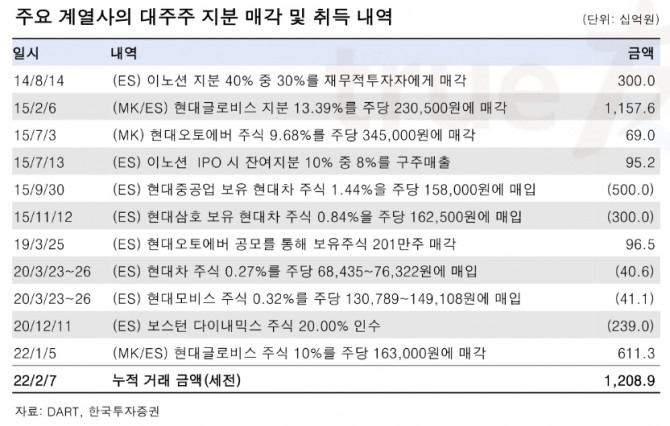 한국투자증권의 ‘현대차그룹 지배구조 개편 분석보고서’에 따르면 정의선 회장(ES)과 정몽구 명예회장(MK)은 지난 2014년부터 주요 계열사의 대주주 지분 매각 및 취득을 통해 1조2089억원 규모의 누적 거래대금(세전)을 마련한 것으로 나타났습니다.
