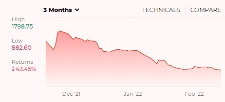 페이티엠의 수익은 34% 증가한 145억6000만 루피(약 2302억 원)였지만 페이티엠의 주식은 11일 거래 마감 시점에 기업공개 가격인 1주당 2150루피(약 3만4099원)에서 1주당 906루피(약 1만5225 원)로 급격하게 폭락했다.