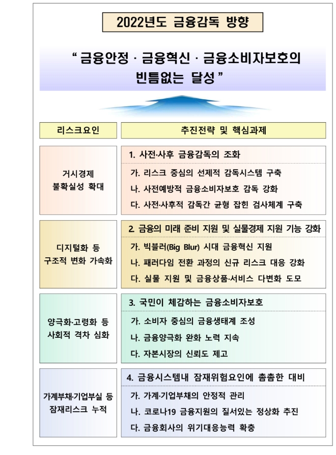 이미지 확대보기금융감독원은 '2022년도 금융감독원 업무 계획'을 14일 발표했다. 금융감독원이 발표한 업무 계획에 따르면 올해 금융감독 목표는 '금융안정, 금융혁신, 금융소비자 보호의 빈틈없는 달성'으로 리스크관리에 초점을 뒀다. 금감원은 ▲ 사전·사후 금융감독의 조화 ▲ 금융의 미래 준비 지원 및 실물경제 지원 기능 강화 ▲ 국민이 체감하는 금융소비자보호 ▲ 가계부채 등 금융시스템 내 잠재 위험요인에 대한 촘촘한 대비 등을 4대 핵심 전략으로 제시했다.