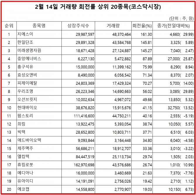 14일 주식시장에서 코스닥 종목의 거래량 회전율 기준 상위 종목은 다음과 같다.