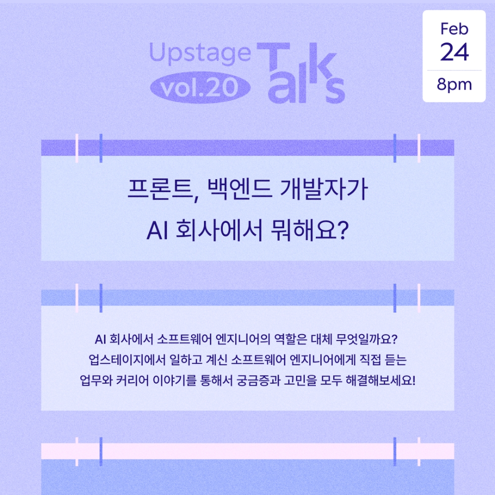 이번 업스테이지 톡의 주제는 '프론트, 백엔드 개발자가 AI 회사에서 뭐해요?'로 업스테이지에서 소프트웨어 엔지니어가 하는 일, 소프트웨어 엔지니어로 일하는 즐거움과 어려움, 소프트웨어 엔지니어들의 커리어 및 업무관련 Q&A의 순으로 진행될 계획이다.