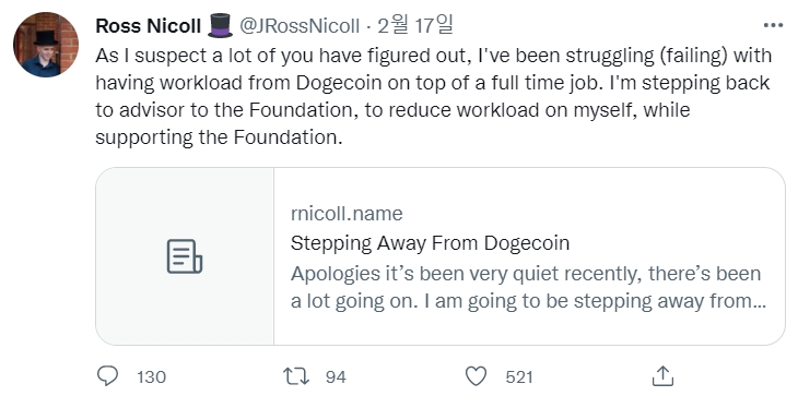 그는 다음날인 17일 트위터를 통해서도 "많은 분들이 아셨겠지만, 저는 도지코인의 업무량을 풀타임으로 처리하는 데 어려움을 겪고 있다. 저는 재단을 지원하는 동시에 스스로 업무량을 줄이기 위해 재단의 고문으로 다시 돌아왔다"라는 글을 게재했다.