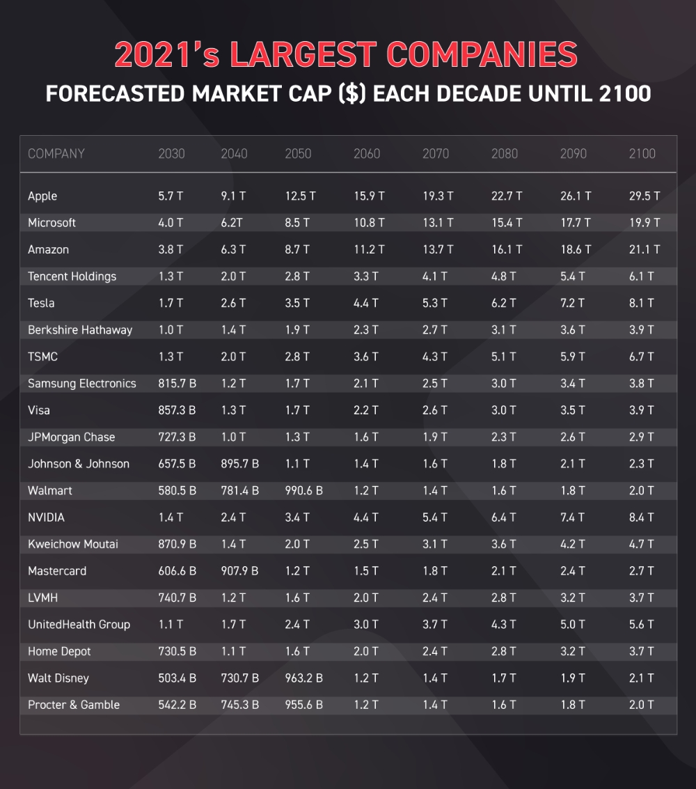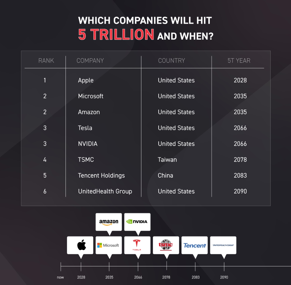 MS와 아마존은 2035년까지, 테슬라와 엔비디아는 2066년까지, TSMC는 2078년까지, 텐센트는 2083년까지, 유나이티드헬스그룹은 2090년까지 각각 시총 5조달러 클럽에 드는 것이 가능할 것으로 예상됐다.