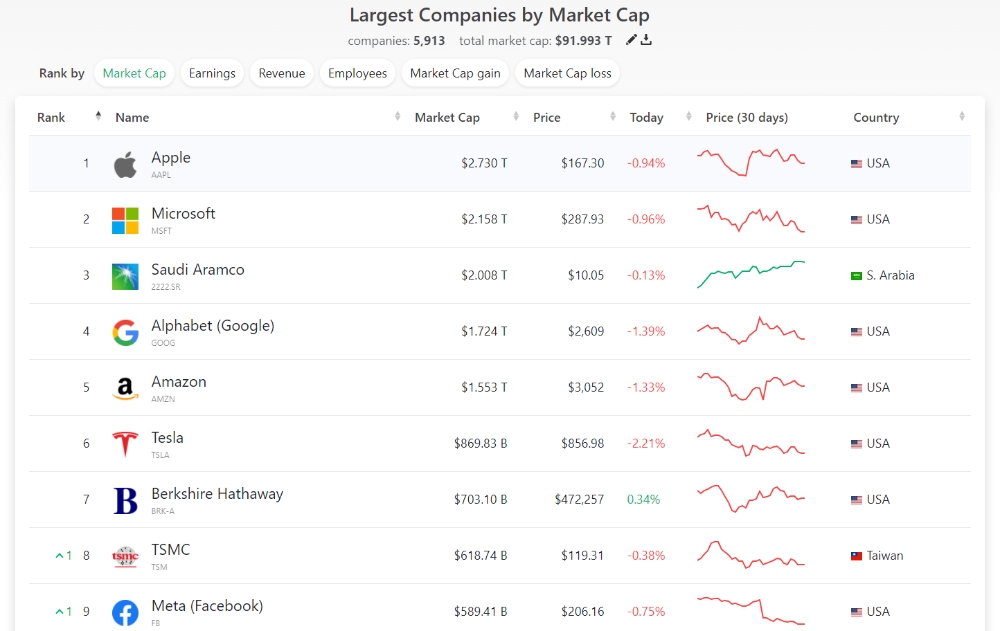 애플 다음으로는 MS, 아마존, 세계 최대 전기차제조업체인 테슬라, 세계 최대 그래픽처리장치(GPU) 업체인 엔비디아, 세계 최대 파운드리(반도체 위탁생산) 기업인 TSMC, 세계 최대 게임업체이면서 소셜미디어 플랫폼 위챗을 운영하는 텐센트홀딩스, 미국 최대 보험사 유나이티드헬스그룹이 유력한 것으로 전망됐다.
