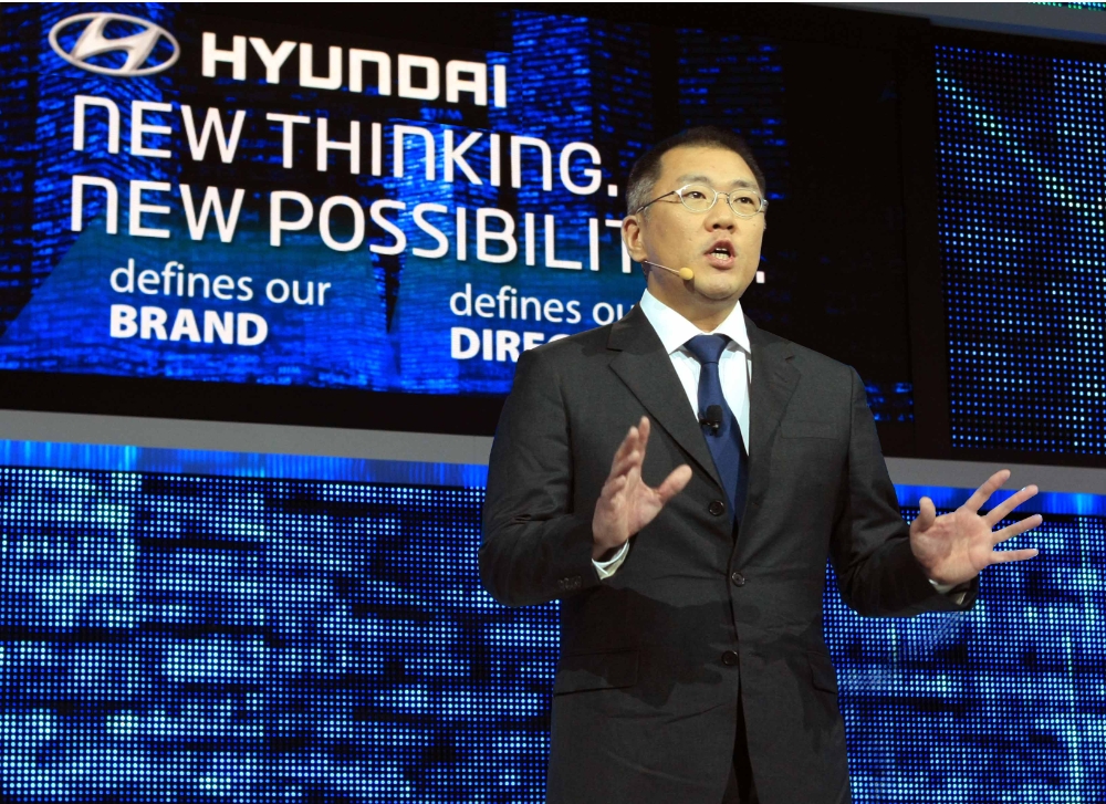 지난 2011년 미국 디트로이트모터쇼에 참석해 현대차의 새로운 슬로건을 발표하는 정의선 회장. 사진=현대차이미지 확대보기