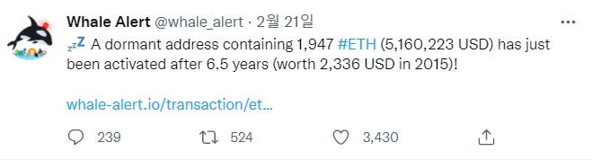 이미지 확대보기암호화폐 전문매체 크립토글로브는 22일(현지시간) 휴면 상태의 이더리움(ETH) 고래가 2015년 이후 처음으로 약 516만 달러(약 62억 원)에 해당하는 거액의 자금을 이동했다고 보도했다.