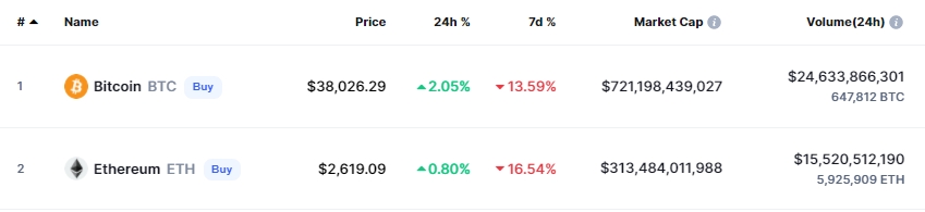 이미지 확대보기한편, 러시아와 우크라이나의 지정학적인 긴장이 고조되고 있는 가운데 이더리움(ETH)는 23일 오전 11시 37분 현재 코인마켓캡에서 전일 대비 0.80% 올라 2619달러 수준에서 거래됐다. 시가총액 1위 비트코인은 2.05% 상승해 3만8026달러가 됐다.