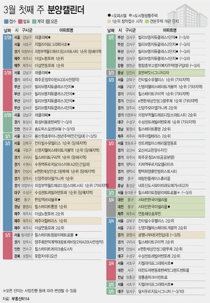 26일 부동산R114 자료에 따르면 3월 첫째 주에 전국 16개 단지에서 총 5446세대(일반분양 4605세대)가 분양을 시작한다.