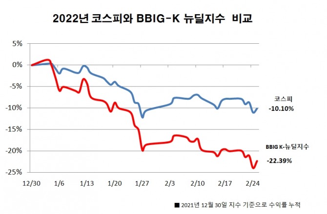 1일 한국거래소에 따르면 BBIG 4개 업종 12개 종목으로 구성된 'KRX BBIG K-뉴딜지수'는 지난해 말 3143.79에서 지난달 25일 2439.92로 22.38% 떨어져 코스피와 코스닥보다 성과가 저조했다. 지수 구성 종목의 전체 시가총액도 지난해 말 376조3279억원에서 지난달 25일 기준 305조4991억원으로 올해 71조12887억원 줄었다. 같은 기간 코스피는 2977.65에서 2676.76으로 10.10% 하락했으며, 코스닥도 1033.98에서 872.98로 15.57% 하락한 것과 비교된다.