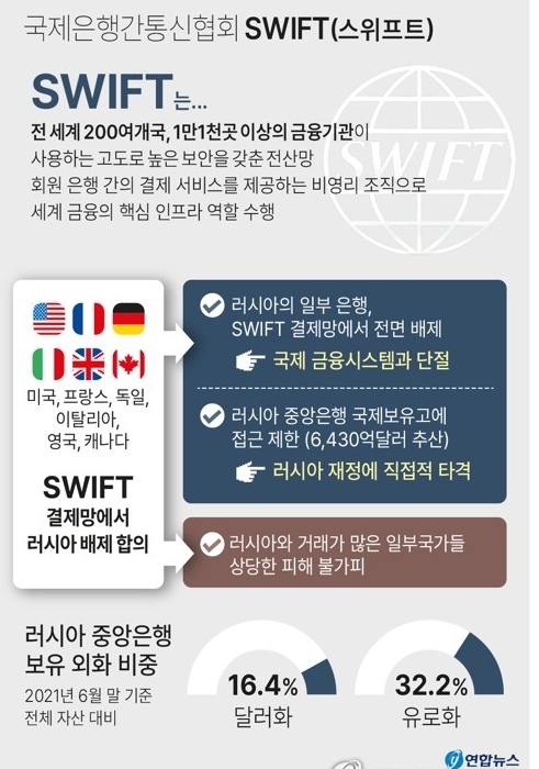 우르줄라 폰데어라이엔 EU 집행위원장은 이같은 조치를 발표하면서 "러시아 중앙은행이 거래를 할 수 없도록 그 자산을 동결할 것"이라고 밝혔다. 그는 또 "스위프트 제외는 이들 은행이 국제금융시스템에서 단절되고 글로벌 영업 능력에 타격을 줄 것"이라며 "은행들은 대부분의 금융 거래를 하지 못하고 러시아의 수출입을 효과적으로 막을 것"이라고 덧붙였다. 독일은 외무장관 성명을 통해 "러시아의 파렴치한 공격 이후 스위프트에서 러시아 분리로 발생할 수 있는 부수적인 피해를 제한하는 데 심혈을 기울였다"고 말했다. 독일은 그동안 스위프트 중단에 대해 소극적이었으나 결국 스위프트 차단 쪽으로 입장을 선회했다. 러시아 중앙은행에 대한 제재가 시행되면 약 7000억달러 규모로 추산되는 보유고 접근이 제한을 받는 만큼 러시아 재정에 직접적 타격이 발생할 수 있다. 러시아 루블화 가치가 크게 떨어질 수 있다.
