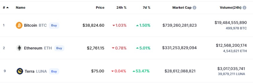 탈중앙화 결제 시스템 테라(Terra)의 기본 코인 LUNA는 지난 22일 48.53달러에서 2월 27일 79.64달러로 5일 동안 64% 이상 상승했다.