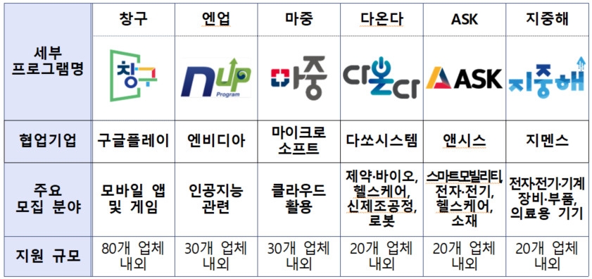 이번 모집 공고는 창구 프로그램(구글플레이 협업)·엔업 프로그램(엔비디아 협업)·마중 프로그램(마이크로소프트 협업)·다온다 프로그램(다쏘시스템 협업)·에이에스케이(ASK) 프로그램(앤시스 협업)·지중해 프로그램(지멘스 협업) 총 6가지 프로그램으로 구성되며, 창업기업 총 200개사를 지원한다.