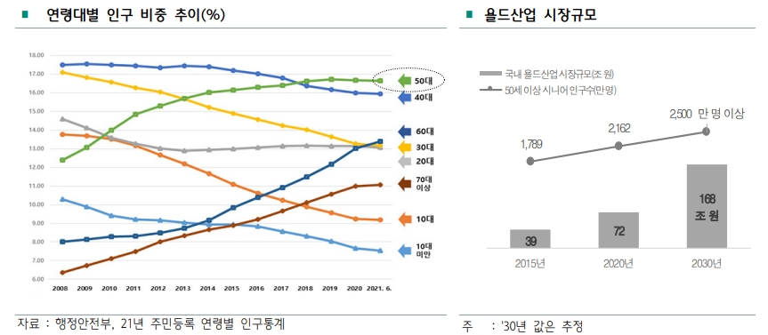 28일 하나금융경영연구소의 ‘뉴시니어를 위한 특화 금융의 필요성’ 보고서에 따르면 국내 욜드(Young OLD) 산업 규모는 2015년 39조원에서 2030년 168조원으로 15년간 4배 이상 폭증할 것으로 전망된다. 이는 국내 연령별 인구 구조 변화에서 기인한다. 해당 보고서에서는 50세 이상 시니어 인구수는 2015년 1789만 명에서 오는 2030년 2500만명 이상으로 급증할 것으로 예상했다. 또한 50대 이상 인구 비중은 지속 증가해 10년 뒤 전체의 절반 이상을 차지한 반면 40대 이하 인구는 큰 폭으로 감소할 것으로 봤다.