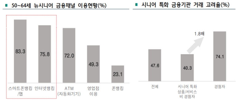 윤선영 하나금융경영연구소 연구위원은 “뉴시니어들은 스마트폰뱅킹·앱의 이용 편리성, 신규 서비스·기능 등에 민감하다”며 “디지털 채널 이용이 활성화된 만큼 보다 고도화되고 개인별 금융 니즈에 최적화된 맞춤 서비스에 대한 기대감이 높다”고 설명했다.