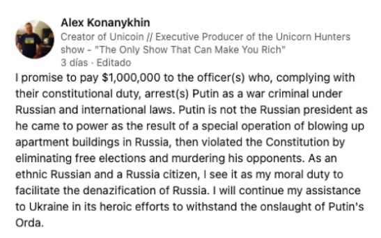 이미지 확대보기3일(현지시간) 현지 외신에 따르면 코나니킨은 소셜미디어 링크드인에 푸틴 대통령의 사진과 함께 "대량학살 죄로 블라디미프 푸틴을 현상 수배한다"는 글을 게시했다.