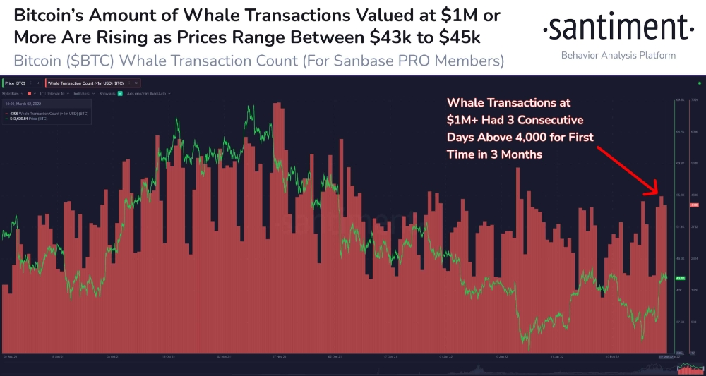최근 가격 펌프 동안 고래 간의 비트코인 거래 활동은 증가하고 있다. 온체인 데이터 제공업체인 샌티멘트(Santiment)는 "#비트코인은 4만3000달러에서 4만5000달러 사이에서 맴돌며, 거래자들은 다음 빅 스윙을 기다리고 있지만, 고래들은 대규모 거래에 점점 더 적극적으로 움직이고 있다. 지난 3일 동안 100만 달러를 초과하는 1만3400건의 BTC 거래가 있었다"라고 밝혔다.