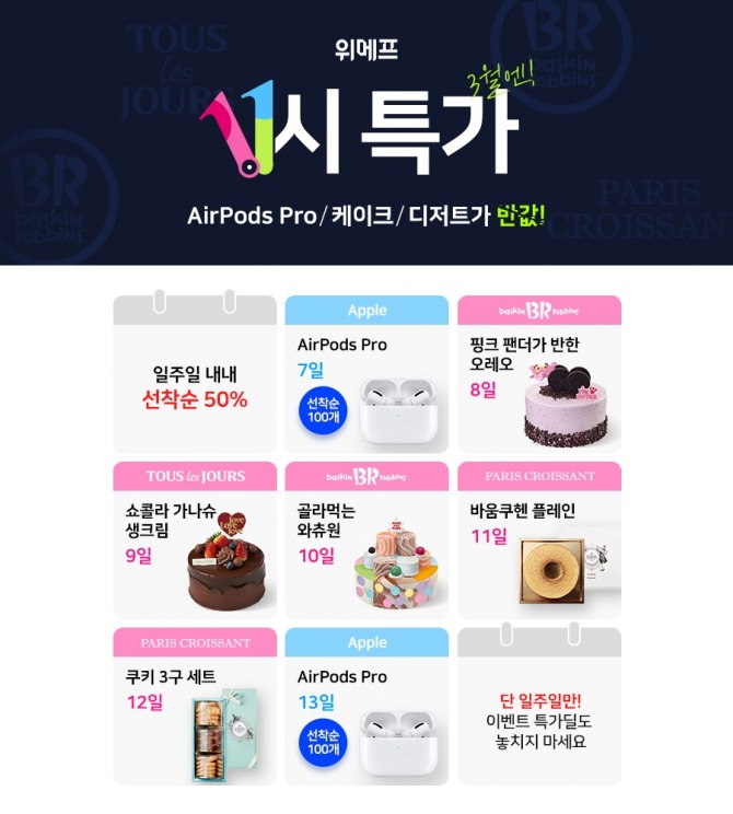 상품별 판매 일정은 △7일 애플 에어팟 프로 △8일 배스킨라빈스 핑크 팬더가 반한 오레오 △9일 뚜레쥬르 쇼콜라가나슈 생크림 △10일 배스킨라빈스 골라먹는 와츄원 △11일파리크라상 바움쿠헨 플레인 △12일 파리크라상 쿠키 3구세트 △13일 애플 에어팟 프로다.