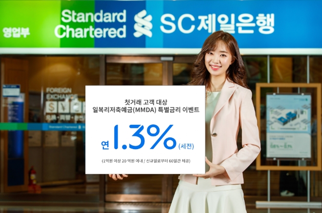 SC제일은행은 오는 31일까지 일복리저축예금(MMDA)에 1억원 이상(최대 20억원이내) 가입하는 첫 거래 고객에게 신규일로부터 최장 60일간 매일 잔액에 대해 최고 1.3%(이하 연, 세전)의 특별금리 혜택을 주는 이벤트를 진행한다.