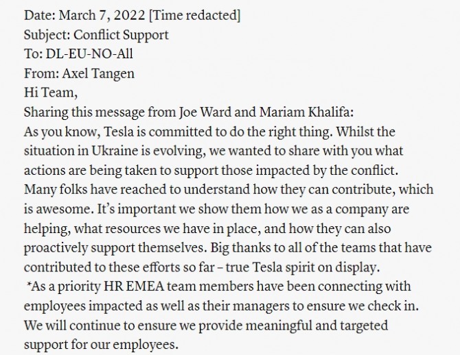 그러나 본사와 주요 사업장이 위치한 미국과 다른 지역에서 일하는 우크라이나 출신 직원들을 대상으로도 테슬라가 같은 조치를 내릴 예정인지는 아직 알려지지 않았다.