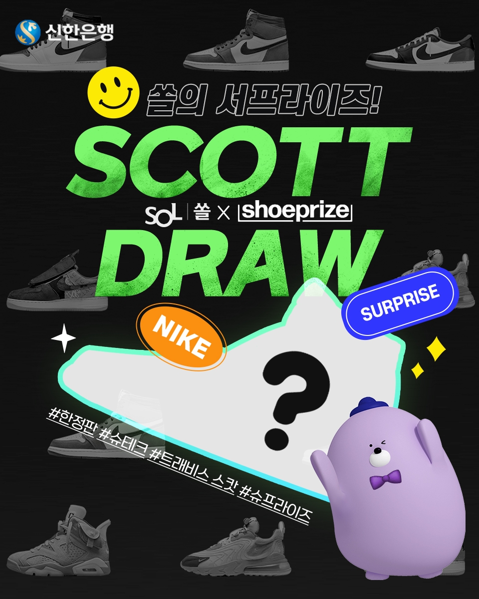 신한은행은 한정판 신발 구입 과정을 하나의 놀이나 문화로 생각하는 MZ세대들을 위해 슈프라이즈 스캇 드로우 이벤트를 3월21일까지 진행한다.