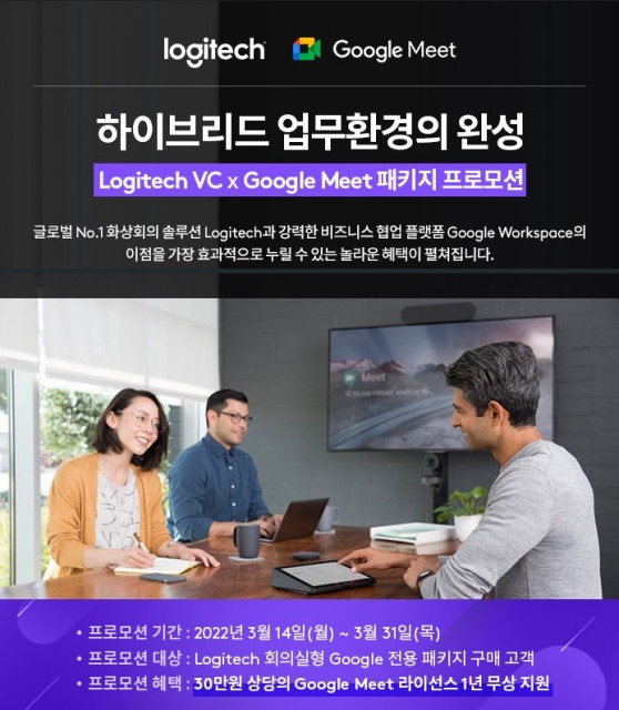이미지 확대보기이번 구글 탭 번들 패키지 프로모션은 로지텍 화상회의 솔루션인 구글 탭 제품을 구매하는 고객에게 구글 밋 라이선스(Google Meet Hardware Management License)를 1년 무상으로 지원하는 것을 내용으로 한다. 현재 로지텍 구글 탭은 국내 최대 엔터테인먼트 기업을 비롯해 다수의 기업이 사용하고 있다.