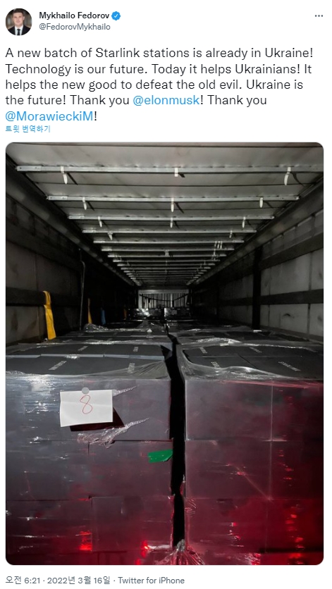 이미지 확대보기전기차 전문매체 인사이드EV는 “머스크 CEO가 스타링크 수신 장비를 우크라이나에 공수하고 있다고 발표했을 때 반신반의하는 사람들도 많았으나 스타링크 서비스가 정상적으로 제공되고 있음이 확인된 것”이라면서 “러시아의 침공으로 전력난도 발생했기 때문에 테슬라스페이스X 측은 위성 인터넷 수신 장비뿐 아니라 테슬라가 생산하는 가정용 태양광 전력장치 파워월도 함께 제공되고 있는 것으로 알려졌다”고 보도했다.