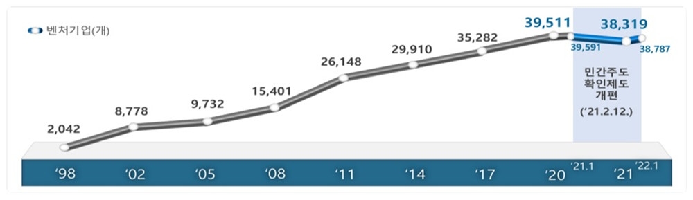 벤처기업 수는 벤처기업확인제도가 시행된 1998년 당시 2042개사에서 제도 개편 전인 2020년 말에는 3만9511개사까지 지속적으로 성장했다.