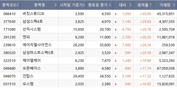 일일 등락률 1위에 오른 버킷스튜디오 역시 컴투스 그룹과 관련 있다. 엔피 모회사인 위지윅스튜디오는 지난해 12월 배우 이정재·정우성 등이 설립한 연예기획사 '아티스트컴퍼니'를 인수한다고 발표했다. 버킷스튜디오는 아티스트컴퍼니 지분 약 15%를 보유한 것으로 알려져 있다.