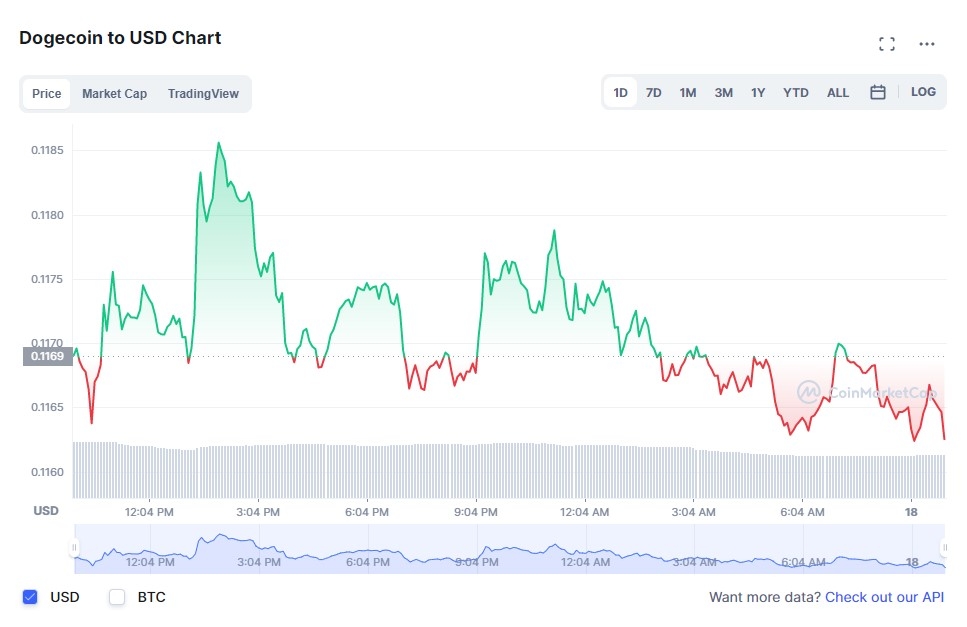 17일(현지시간) 도지코인/USD(달러) 1일 차트. 도지코인이 전일 대비 0.55% 하락해 0.1162달러 수준에서 거래 되고 있다. 출처=코인마켓캡