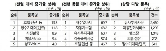 품목별로는 호텔·펜션(13.3%), 정수기대여(11.8%), 사진촬영(8.9%) 순으로 상담이 증가했다.