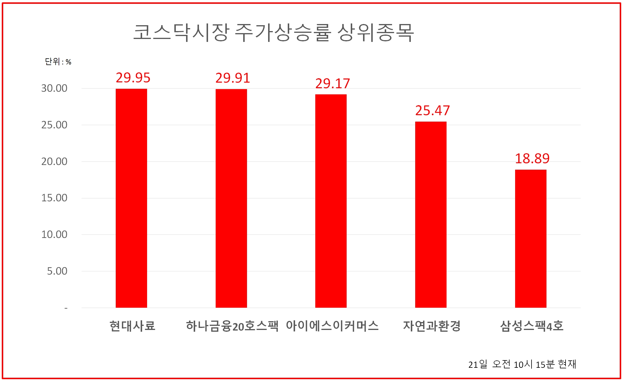 현대사료 뒤를 이어 하나금융20호스팩도 29.91% 상승했으며, 아이에스이커머스도 29.17% 상승해 코스닥 시장 주가상승률 상위권에 이름을 올렸다.