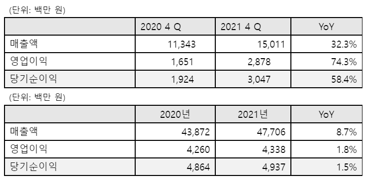 2021년 총 매출액은 477억원, 영업이익은 43억원으로 집계됐다. 각각 전년 동기 대비 매출액은 8.7%, 영업이익은 1.8% 증가한 수치다.