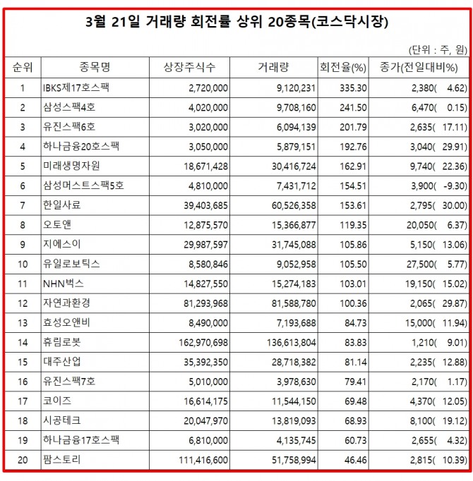 21일 주식시장에서 코스닥 종목의 거래량 회전율 기준 상위 종목은 다음과 같다.