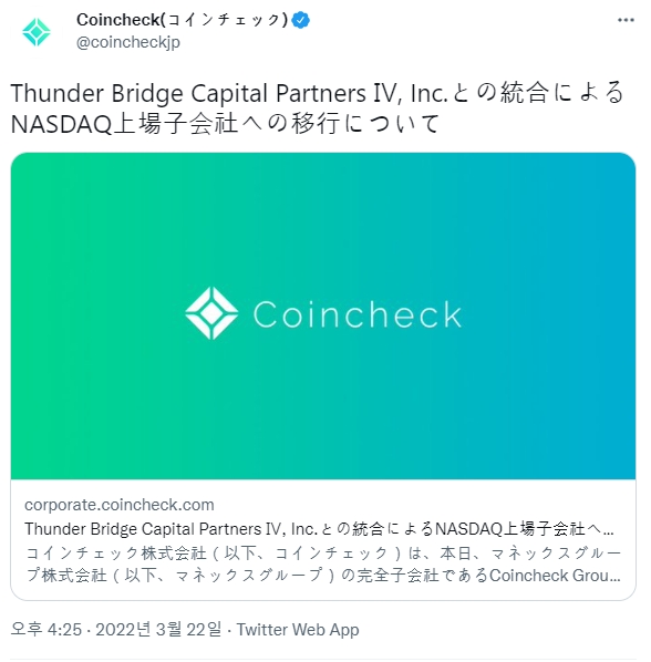 제안된 사업 결합은 코인체크, 모넥스(Monex) 및 썬더 브리지 IV의 이사회에서 만장일치로 승인되었으며 2022년 하반기에 완료될 것으로 예상된다. 그 후 코인체크 그룹 NV(Coincheck Group NV)라는 새로운 법인이 나스닥 글로벌 셀렉트 마켓 'CNCK' 티커로 상장될 예정이다.