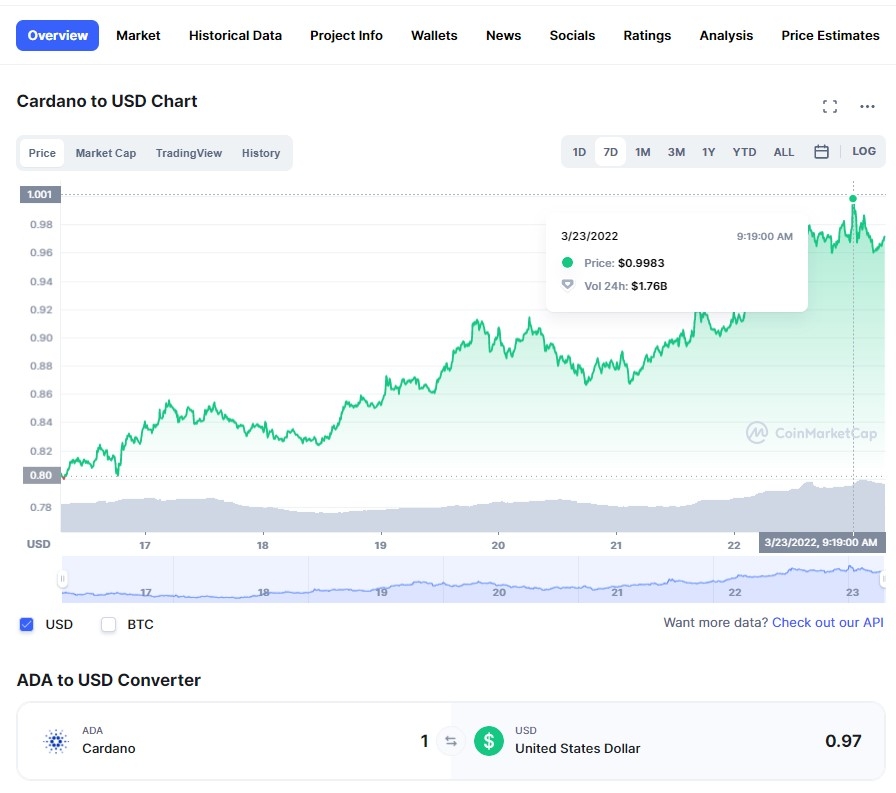 23일(한국시간) 오후 3시 52분 현재 코인마켓캡에서 카르다노의 ADA 토큰은 24시간 전 대비 3.51% 상승해 0.9707달러 수준에서 거래됐다. 카르다노는 장중 한때 최고 0.9997달러까지 치솟아 1달러 대 재진입 초읽기에 들어갔다. 총 시가 총액은 순간적으로 급등해 2조 달러에 이르렀다. 이 수치는 3월 초 마지막으로 도달했다.