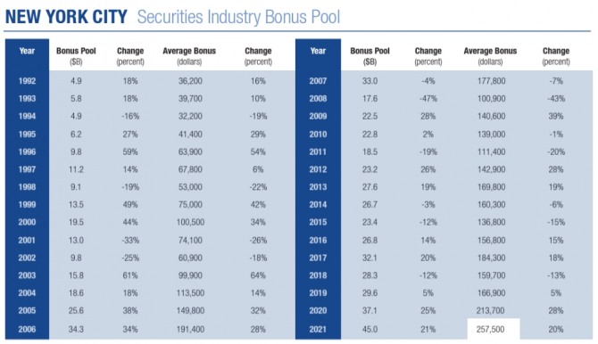 뉴욕주 감사원의 보고서에 따르면 월가 금융인들의 평균 보너스가 코로나 사태가 터진 지난 2020년보다 20%나 증가해 사상 최고를 기록했다. 2020년 평균이 21만3700달러(약 2억6000만원)이었으므로 약 5000만원 증가한 셈이다.