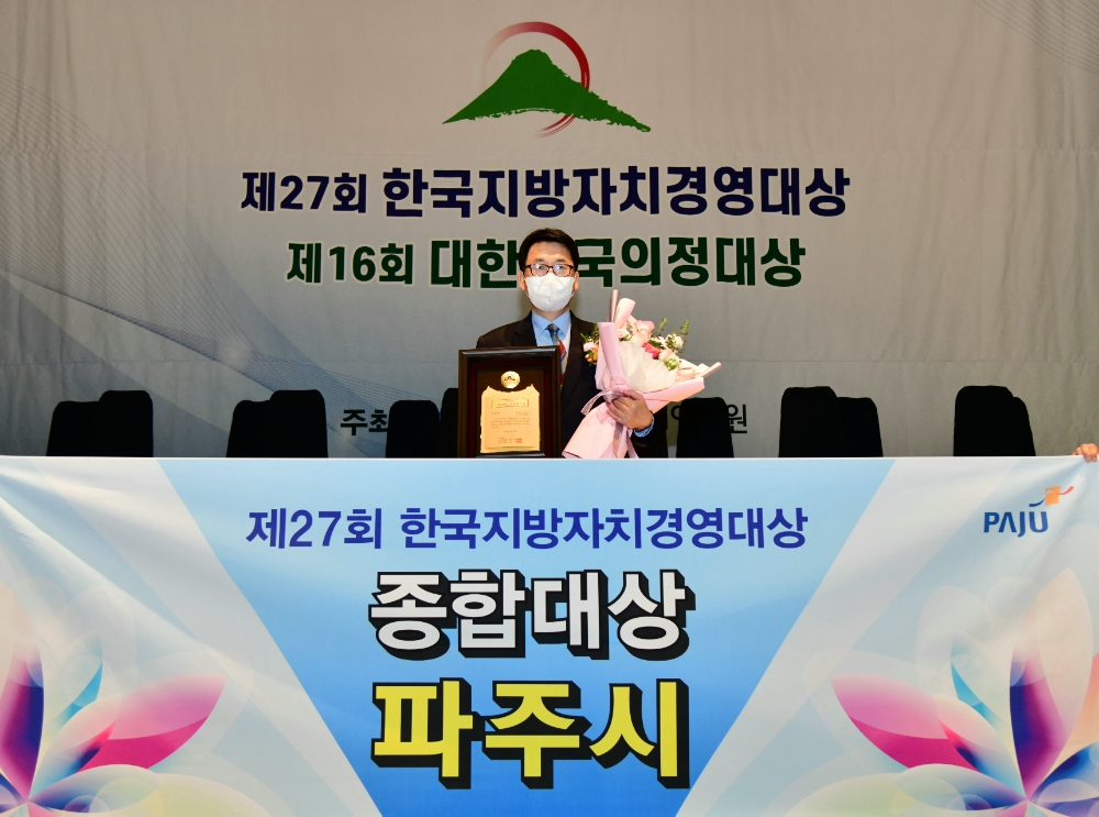 경기도 파주시가 지역 간의 격차를 해소하고 주민의 경제력 향상과 복지 증대 등 지속적인 발전을 도모한 것을 인정받았다.파주시는 24일 (사)한국공공자치연구원이 주관하는 제27회 한국지방자치경영대상에서 종합대상을 수상하는 영예를 안았다. 파주시가 그간 행정혁신, 경제활성화, 환경안전 등 부문별 평가에서 수차례 대상을 수상해 왔지만, 전 분야 평가에서 최고득점을 받아야만 하는 종합대상을 수상한 것은 15년만이다.