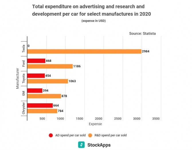 스톡앱스에 따르면 테슬라가 광고비로 쓴 돈이 한푼도 없는 것으로 나타난 점도 이목을 끄는 대목이다.