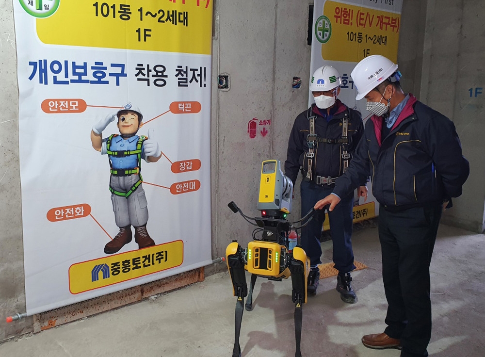 ‘로봇개(스팟)’은 현장 곳곳의 상황을 실시간으로 촬영해 현장사무실과 본사에 전송하는 시스템을 갖추고 있다.