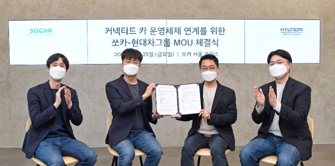 이미지 확대보기현대차는 지난 25일 서울시 성동구에 있는 쏘카 서울오피스에서 ‘커넥티드 카 운영체제 연계를 위한 업무 협약(MOU)’을 체결했다고 27일 밝혔다.