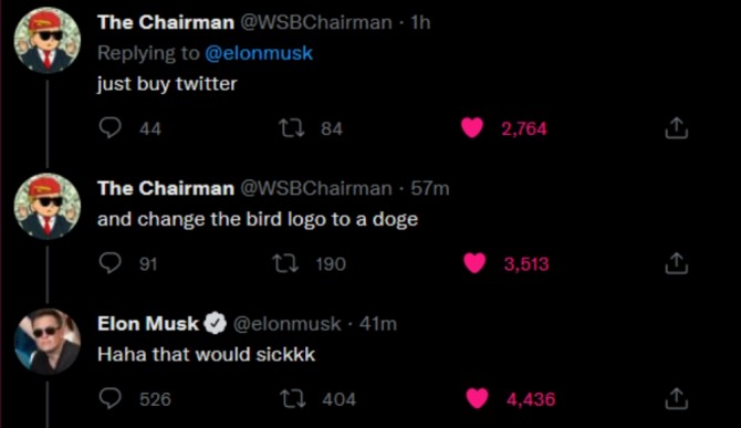 27일 일론 머스크는 트위터를 인수하고 새 로고를 Doge의 로고로 변경하는 아이디어에 대해 언급하면서 '병'이 될 것이라고 주장했다.