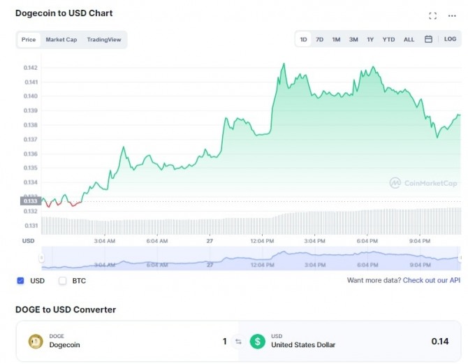 코인마켓캡(CoinMarketCap)에서 제공한 데이터에 따르면 도지코인(DOGE)의 가격은 지난 24시간 동안 약 5% 급등했다. 비트코인(BTC)은 0.97% 올라 4만4681달러가 됐다. 이더리움(ETH)은 1.03% 상승해 3148달러다.