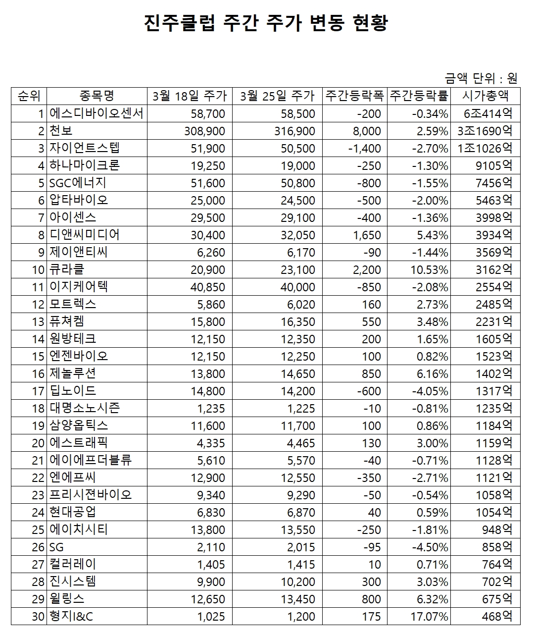 30개사로 구성된 '진주클럽'의 전체 시가총액은 한주간558억원(0.3%) 증가하며 25일 기준 16조5288억원을 기록했다.