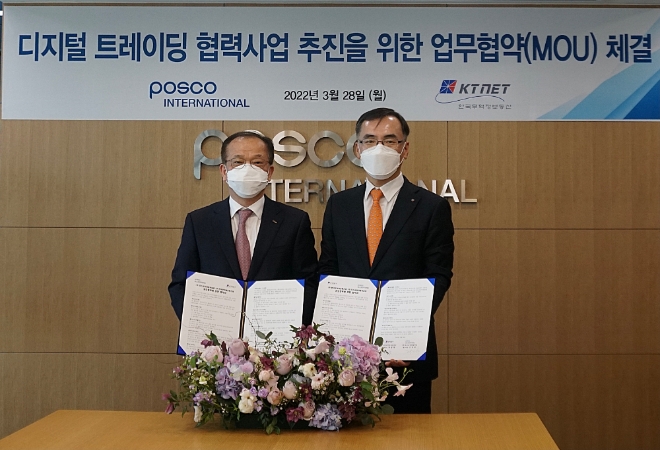 이미지 확대보기포스코인터내셔널은 28일 한국무역정보통신(KTNET)과 무역 디지털화 추진을 위한 업무협약(MOU)을 체결했다고 밝혔다. 이날 협약식은 포스코타워 역삼센터에서 열렸으며, 주시보 포스코인터내셔널 사장과 차영환 KTNET 대표이사 등이 참석했다.