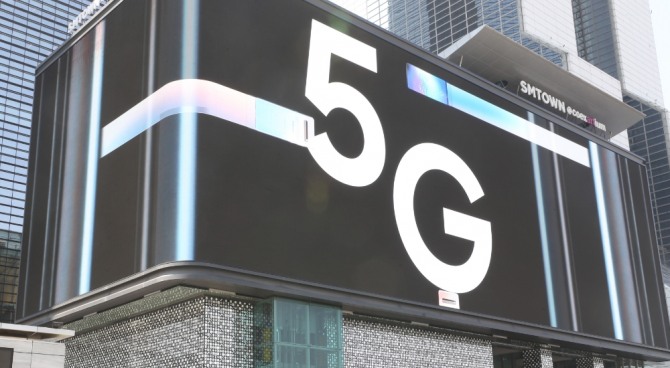 2019년 4월 세계 최초 5G 상용화를 알리기 위해 서울 삼성동 코엑스 전광판에 걸린 광고. 사진=뉴시스이미지 확대보기