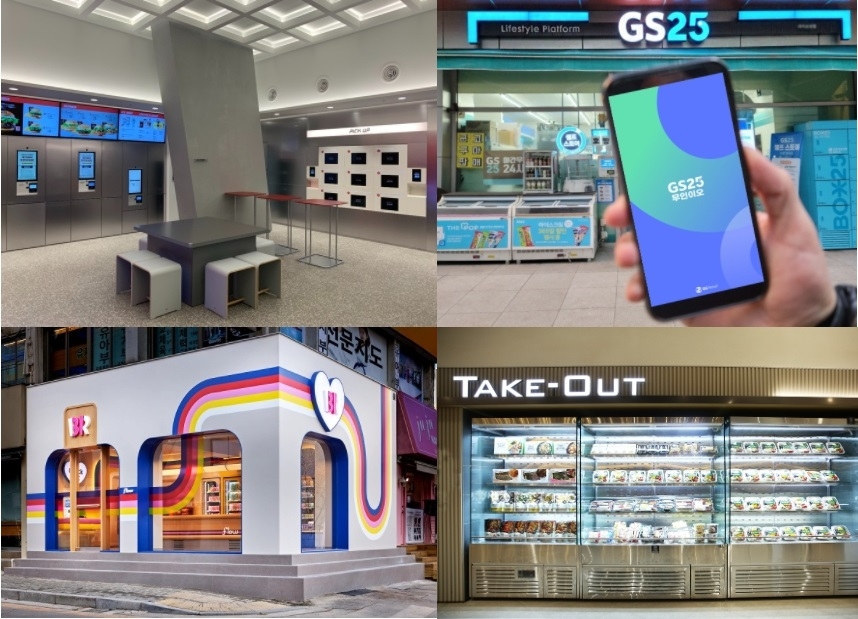 (왼쪽 위)롯데리아 L7홍대점 스마트존에 설치된 무인주문 및 무인픽업 존. (오른쪽 위), GS25의 무인점포 출입관리 등 돕는 모바일 원격관리 솔루션 '무인이오', (왼쪽 아래) 배스킨라빈스의 완전무인매장 '플로우', (오른쪽 아래) 아워홈의 무인판매 플랫폼 '픽앤조이' 사진= 각사 제공