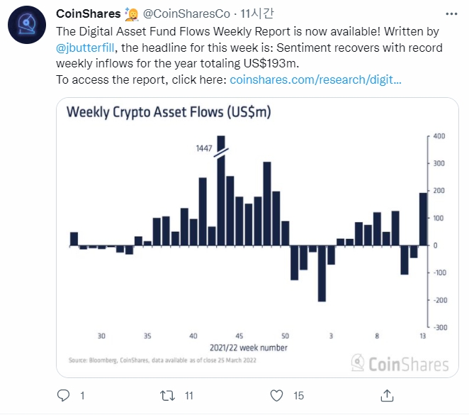 이미지 확대보기디지털 자산 운용사인 코인셰어스(CoinShares)가 28일 공개한 보고서에서 언급한 이번 유입은 2주 연속 유출을 포함하는 최근 추세의 반전을 나타냈다.