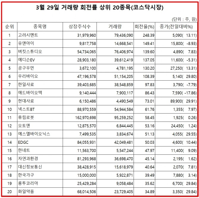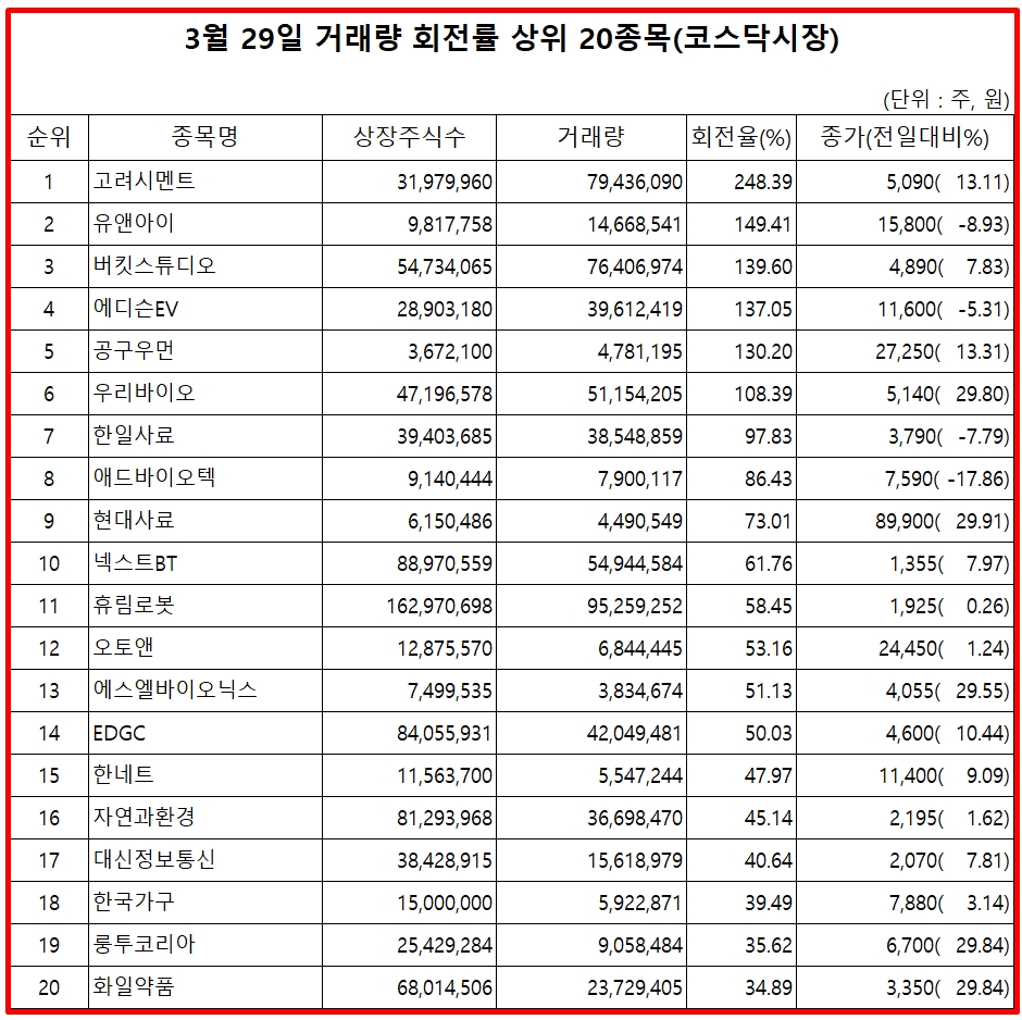 29일 코스닥 시장에서 거래량 회전률 기준 상위 종목은 다음과 같다.
