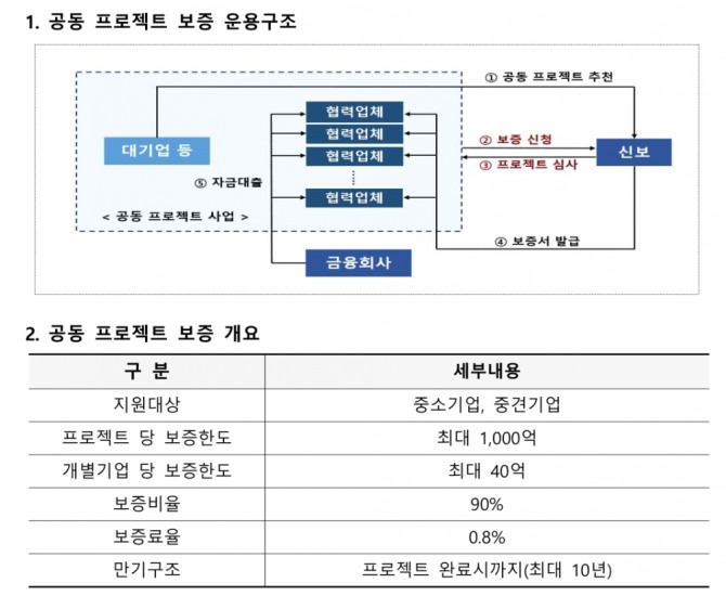 ‘공동 프로젝트 보증’은 대기업 등과 협력기업이 공동으로 추진하는 프로젝트의 사업성을 평가해 신보가 협력기업에 보증을 지원하는 상품으로, 신용도가 낮거나 재무비율이 취약한 협력기업도 지원이 가능하다.