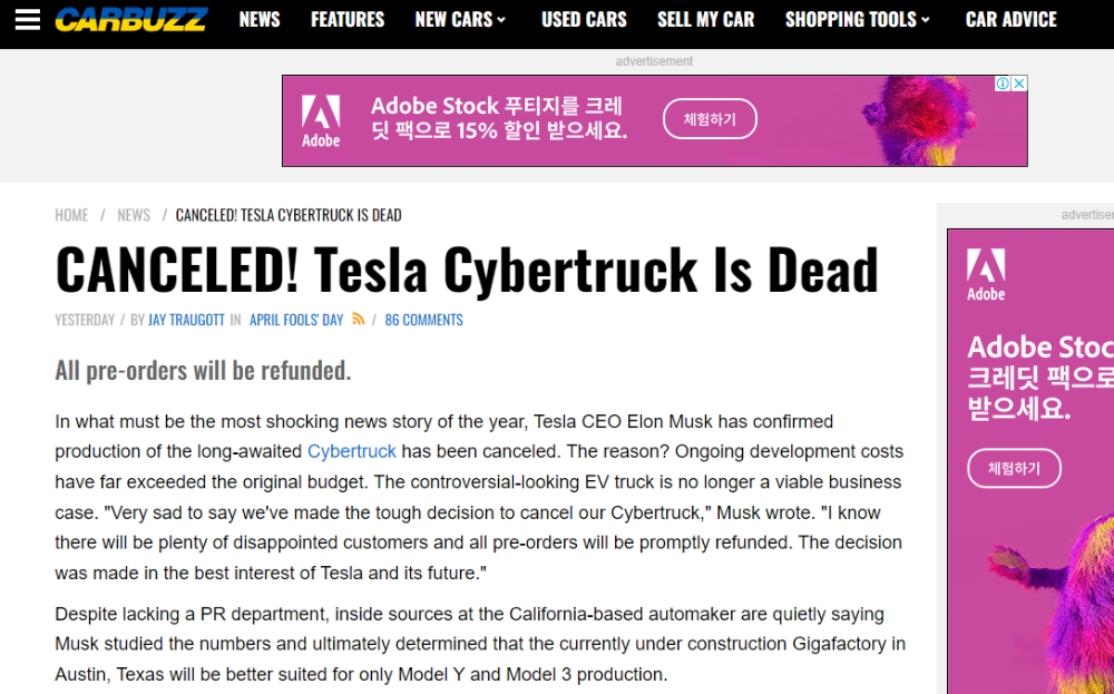 미국의 자동차 전문매체 카버즈는 이날 타전한 속보에서 “소비자들이 고대해온 테슬라 사이버트럭의 출시를 전면 취소하겠다는 입장을 일론 머스크 테슬라 최고경영자(CEO)가 밝혀 충격을 던져주고 있다”고 보도했다.